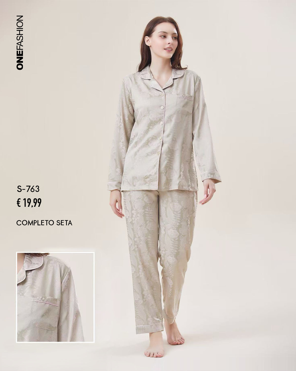 Questo completo effetto seta unisce delicatezza e fascino con un design floreale discreto. Perfetto per coccolarsi con stile, ogni sera diventa un’occasione speciale.